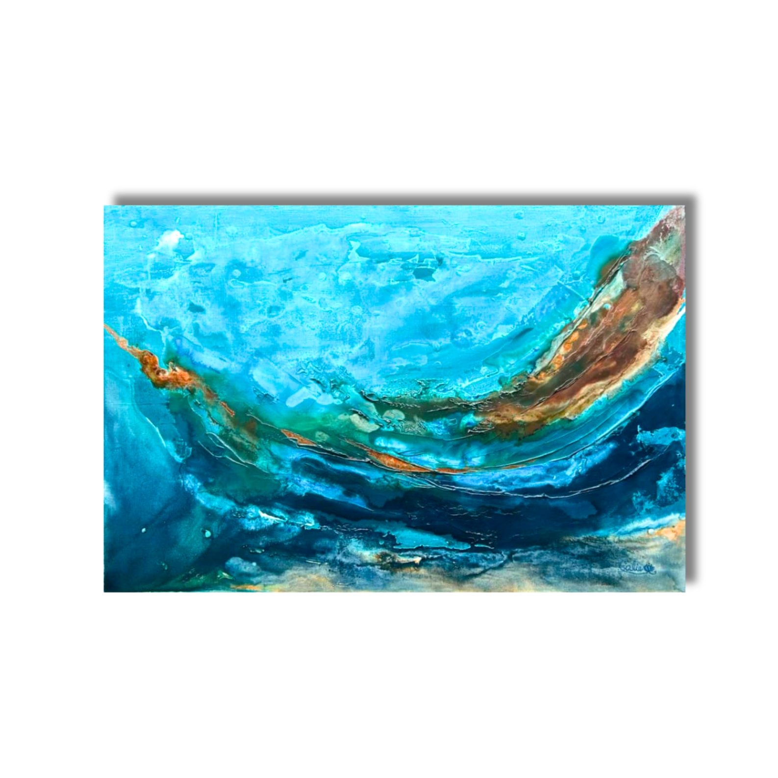 Cette oeuvre est insprirée par la beauté des courants marins où l’on y retrouve l’application de reliefs et de teintes rappelant la vie bien gardée sous les écumes. Une ode à cet écosystème si fragile.